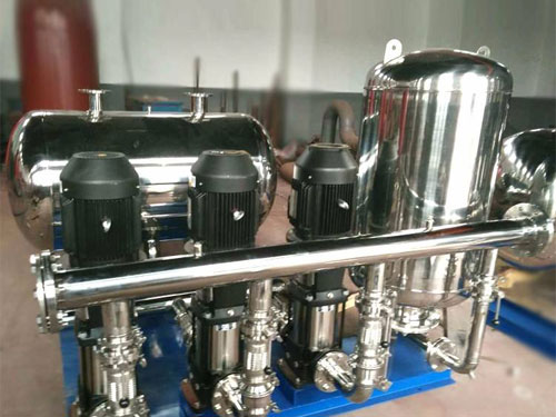 TPE系列氣壓自動(dòng)給水設(shè)備由水泵機(jī)組、電控系統(tǒng)、氣壓罐、壓力控制器、閥門管路、共同底座等組成。其中,氣壓罐采用隔膜式,設(shè)備運(yùn)行時(shí)氣水分離。設(shè)備運(yùn)行時(shí),要根據(jù)供水壓力向氣壓罐氣室充氣至適當(dāng)值。同時(shí)整定壓力控制器上限、下限值。裝于氣壓罐表座并密封嚴(yán)。水泵運(yùn)動(dòng)時(shí),向管網(wǎng)及氣壓罐膠膽內(nèi)供水。隨著膠膽內(nèi)充水量增加,氣室內(nèi)氣體被壓縮,壓力上升。當(dāng)壓力升至上限值時(shí),發(fā)信號(hào)至電控柜,停止水泵運(yùn)行,由氣室內(nèi)氣體膨脹釋放膠膽水向管網(wǎng)供水。伴隨著膠膽內(nèi)水量減少,氣室氣體的膨脹,壓力逐漸降低,當(dāng)壓力降至下限時(shí),再次啟動(dòng)水泵供水。如此周而復(fù)始,實(shí)現(xiàn)全自動(dòng)供水。由于采用衛(wèi)生膠膽作為氣壓罐內(nèi)腔,實(shí)現(xiàn)了氣水分離式供水,有效地避免了水質(zhì)二次污染,其次氣壓罐一次充氣,長(zhǎng)期使用,設(shè)備運(yùn)行可靠,操作簡(jiǎn)單,使用方便,故該設(shè)備適宜于水量不很大樓群、單棟住宅樓及其它場(chǎng)所生活供水選用。